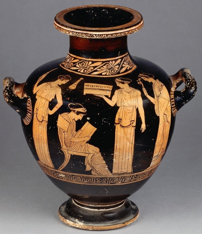 A Hidria – ὑδρία, em grego – era um vaso usado para transportar água, azeite ou votos de juízes. É possível que a figura sentada lendo um papiro seja a poetisa Safo (c.630-570 a.C.). Ao seu redor, três serviçais de pé, portam, cada uma, um objeto diferente. Da esquerda para a direita: a primeira carrega uma bolsa, que deve conter alguns objetos pessoais da poetisa; a segunda levanta na direção de Safo uma caixa ornamentada, na qual talvez estejam outros rolos de papiro; e a terceira segura o que sugere ser um ramo de oliveira. Todas estão trajadas com um chíton – χιτών, em grego –, túnica de lã ou linho e aparentam interesse no texto que a poetisa lê.