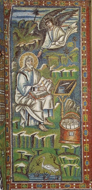 Anônimo. São Mateus escreve em um códice, inspirado por um anjo, mosaico, século VI, Basílica de São Vital, Ravena – Itália. A seus pés, um cesto redondo com vários papiros. A cena é uma maravilhosa síntese da crucial mudança do suporte dos textos.