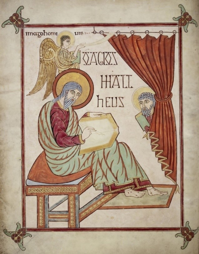 Sua representação no Tetramorfos (um anjo, nesse caso manuscrito com um livro e uma trombeta). Um homem aureolado, também com um códice, desponta por trás da cortina e presencia a cena. Nos primeiros séculos da expansão do Cristianismo na Europa, muitos iluminadores de manuscritos que decoraram as Escrituras (e evangeliários, saltérios etc.) representaram os quatro evangelistas redigindo seus respectivos evangelhos. Assim, firmaram essa imagem na tradição manuscrita: um homem com um livro, escrevendo, absorto, meditando o que escreveu. Consolidaram imageticamente o vínculo cultural entre a fé e o texto.