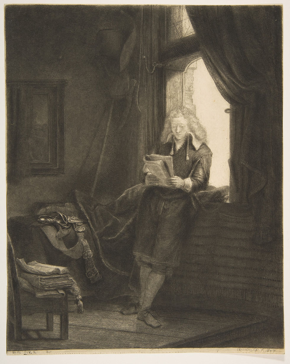 Os mecenas da arte na Holanda do século XVII foram os grandes comerciantes (os burgueses) e as instâncias governamentais. Além de adquirir obras de arte como símbolo de riqueza, esses burgueses queriam ser retratados em todo o seu luxo e poder. A recém-formada burguesia estava ansiosa por se autoafirmar. Por vezes, preferiam mostrar um lado erudito, representados lendo ou rodeado de livros, como vimos na Fig. 14. Mas, por outro lado, Rembrandt pintou e gravou, principalmente, poderosos homens junto a seus atributos de poder que variavam desde montes de moedas de ouro às armadas de navios atracados em um cais atrás do personagem retratado. Muitas dessas gravuras e desenhos estão abrigados no Museu Casa Rembrandt, em Amsterdã.